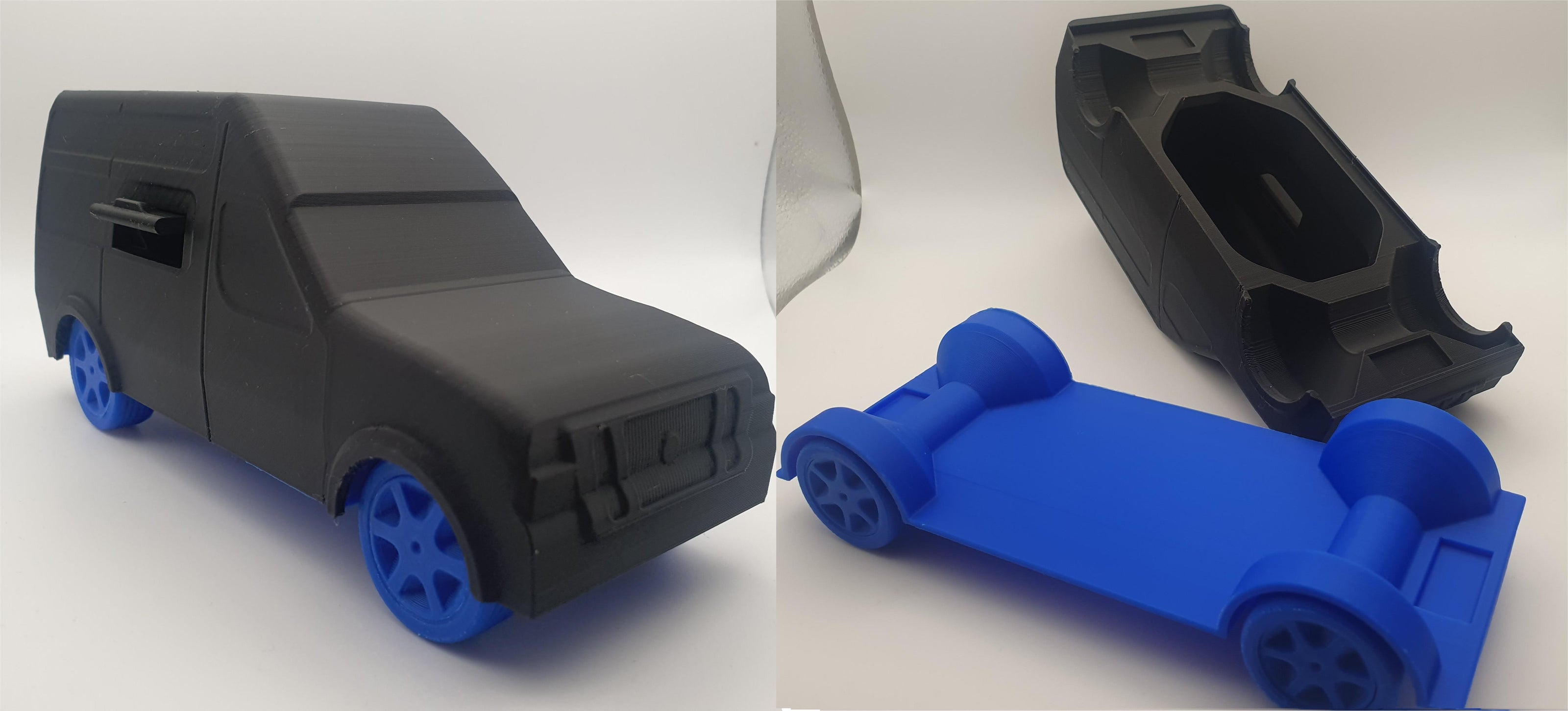 The Nissan van design includes a large hidden storage compartment for secure cargo. It features a removable chassis with freely rotating wheels, allowing for easy movement. The van also has a window slot that can be opened or closed.